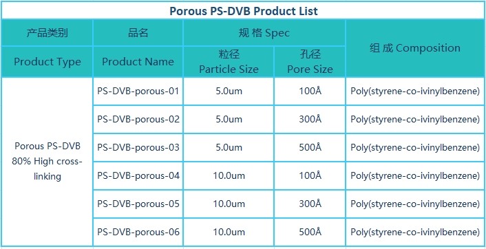 单分散PS-DVB微球,有孔PS-DVB,无孔PS-DVB / Monodisperse PS-DVB microspheres, porous PS-DVB and non-porous PS-DVB.